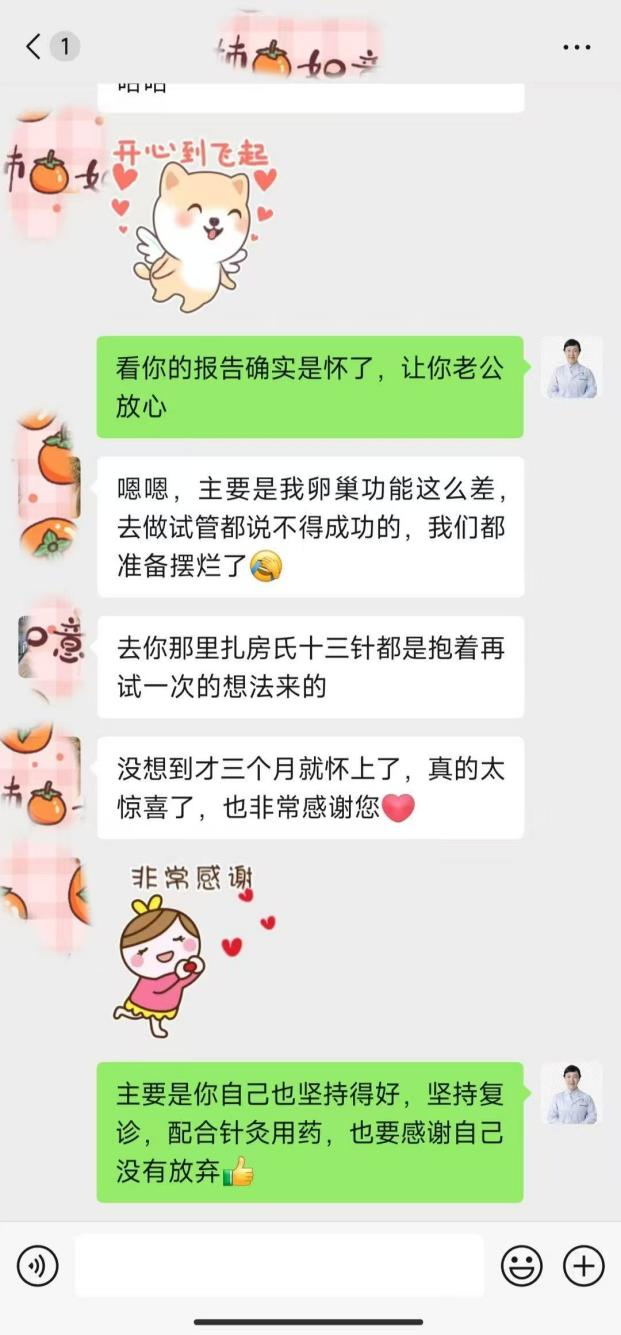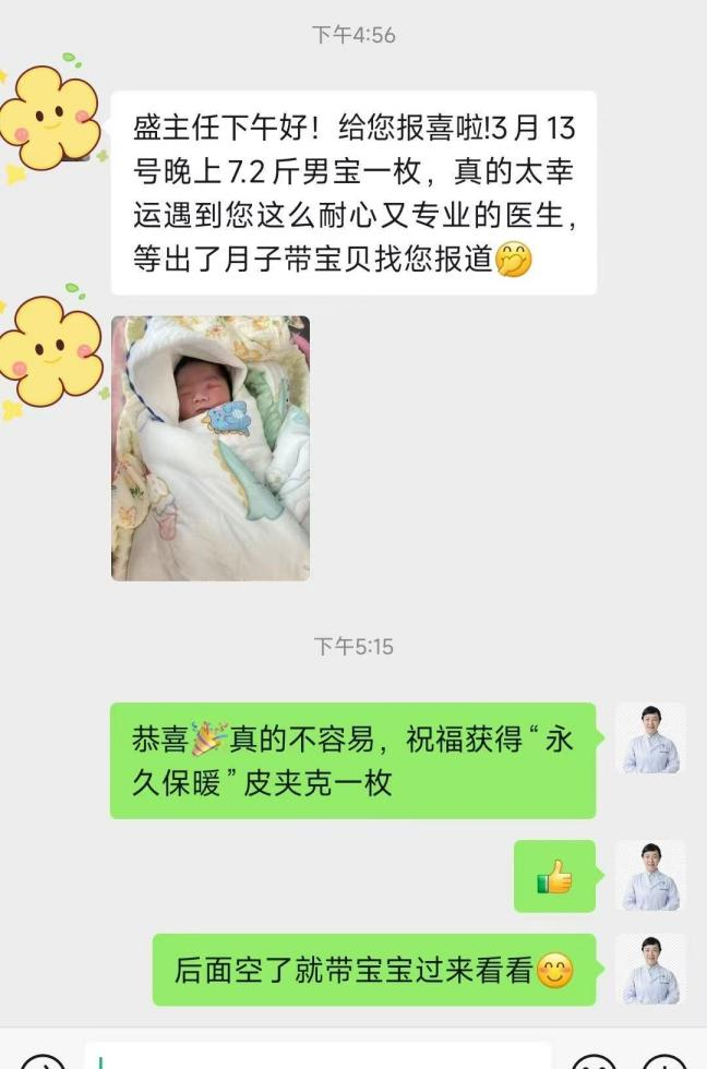 2023年12月,来院找盛主任采用调经促孕十三针针灸和中医综合调理。经过4个月的坚持调理她的卵巢功能得以改善,并于2024年5月取卵移植成功,顺利生下了宝宝。